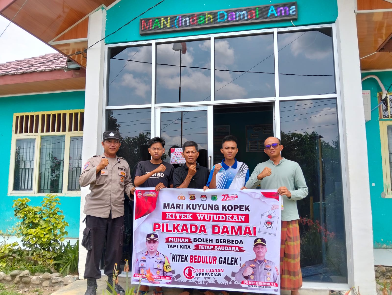 Giat sosialisasi Pilkada Damai dengan pemasangan stiker bertagline “Mari Kuyung Kopek Kitek Wujudkan Pilkada Damai” dan tagline “Pilihan Boleh Berbeda Tapi Kita Tetap Saudara, Kitek Bedulur Galek” dan Deklarasi Pilkada Damai tersebut dilakukan di Kantor Desa Jembatan Gantung Kecamatan Jirak Jaya dan Kantor Desa Rantau Sialang Kecamatan Sungai Keruh Kabupaten Musi Banyuasin, Rabu (23/10/2024).